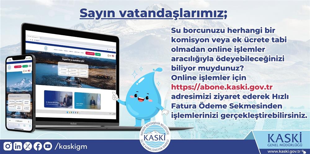 Sayın vatandaşlarımız; Su borcunuzu herhangi bir komisyon veya ek ücrete tabi olmadan online işlemler aracılığıyla ödeyebileceğinizi biliyor muydunuz? Online işlemler için https://abone.kaski.gov.tr adresimizi ziyaret edebilirsiniz.